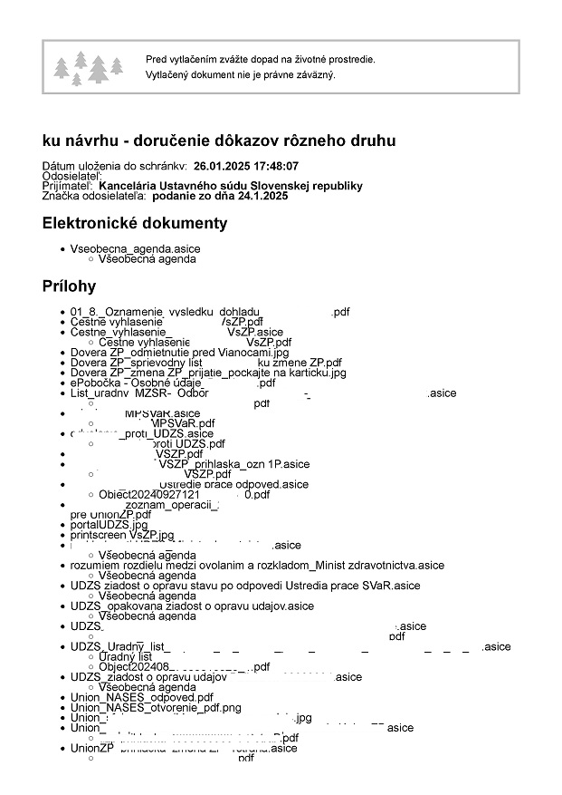 Dôkaz antedatovania je v červených rámčekoch nižšie, bolo doručených 45 príloh + ústavná sťažnosť, celkovo viac ako 100 strán (číslo „20“ je počet strán spisu, čo je možné iba skartovaním strán spisu). Ústavný súd celé konanie zmietol zo stola, rozhodnutie postavil na tom, že nepridelil advokáta, „konanie má vážne obsahové a formálne nedostatky, chýba petit (návrh rozhodnutia)“ a takto obišiel navrhované predbežné opatrenie (predbežné opatrenie nevydal ani jeden úrad / orgán; všetky ale žiadosť o to dostali). Keď nemáte advokáta, skončili ste a týmto spôsobom Ústavný súd zatajil použitie svojej právomoci z § 132 ods. 3 zákona o Ústavnom súde a vyhol sa aj ochrane osoby podla Dohovoru OSN (skr. UN CRPD).