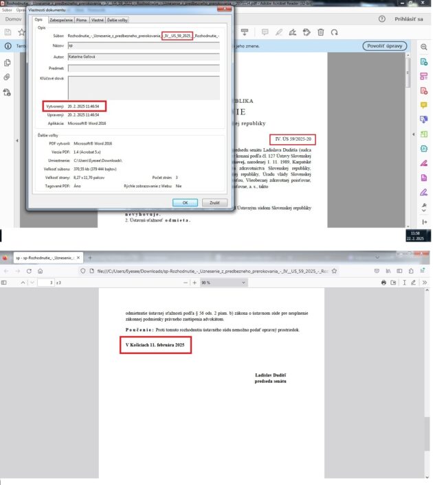 Aj toto doplnenie, plné európskeho ludskoprávneho práva (Dohovor o ludských právach a základných slobodách, Rím 1950) Ústavný súd obišiel antedatovaním svojho rozhodnutia 11.2.2025, ale REÁLNE VYTVORENÉHO A ÚRADNE (autorizačnou služobnou kartou) PODPÍSANÉHO 20. 2. 2025 (červené rámčeky vyššie).