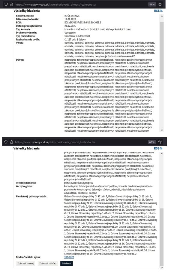Ústavný súd SR uviedol, „podanie má vážne obsahové a formálne nedostatky, chýba argumentácia, chýba príčinná súvislosť, chýba petit (návrh rozhodnutia)“ a tieto nedostatky sú spôsobené absenciou advokáta – túto kritiku versus reálny obsah si môžete porovnať nižsie. „Chýbajúci petit“ nájdete v druhej polovici tohto článku, bod za bodom tučným písmom. Úplne na konci je printscreen z webu Ústavného súdu a vlastnosti rozhodnutia, ktoré zverejnil. Správne súdnictvo v tomto prípade autor použiť nemohol a ak by sa aj mohlo, platí vyššieuvedený §132 ods. 3.